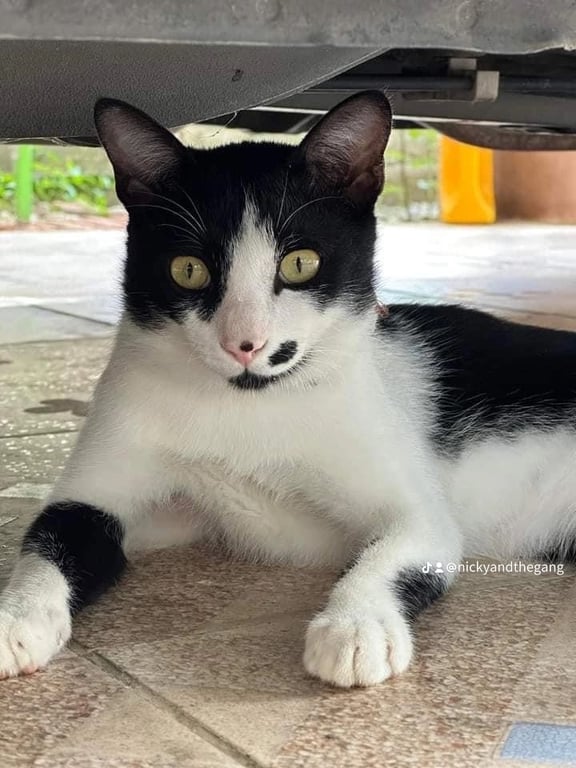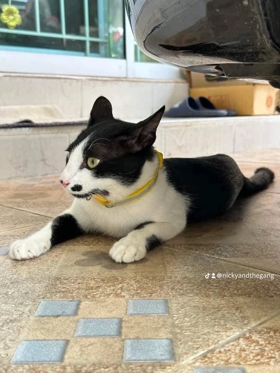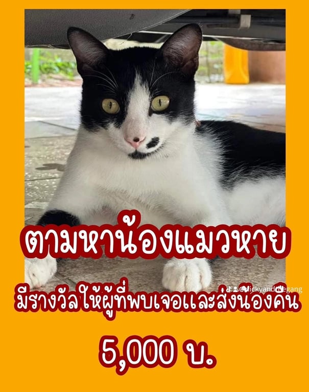 รอยตำหนิ: สีขาว-ดำ มีไฝติดจมูกขี้เล่น ร่าเริง วันที่น้องหายสวมปลอกคอสีเหลือง