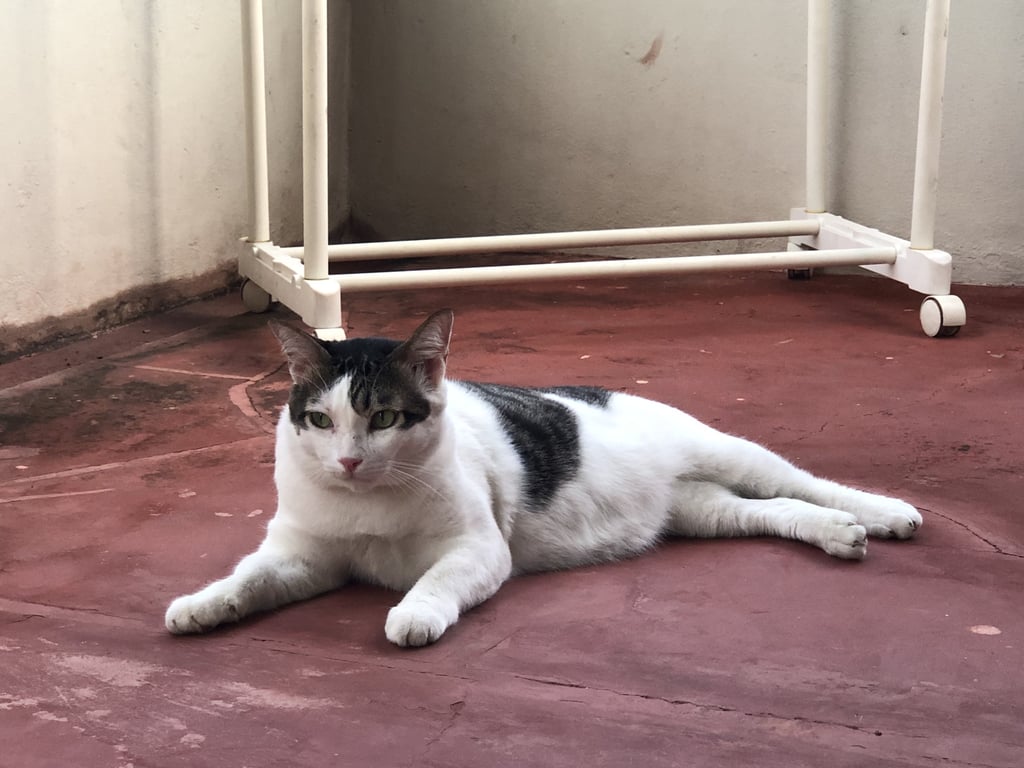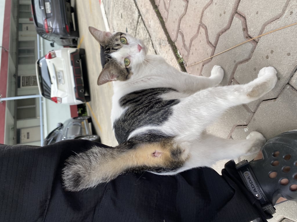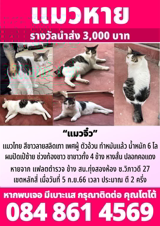 รอยตำหนิ: ผมปัดเป๋ซ้าย หางสั้น ช่วงท้องขาว ช่วงขาขาวทั้ง 4 ข้าง ปลอกคอสีแดงเป็นแมวตัวอ้วน น้ำหนักเกือบ 6 กิโล ไม่กลัวคน แต่ไม่ยอมให้จับ