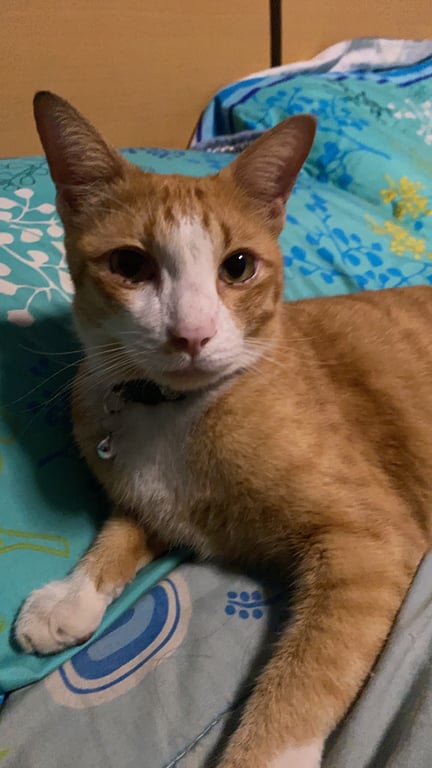 รอยตำหนิ: ถุงเท้าสีขาวสี่ข้าง ปลอกคอสีชมพู หางยาวตรงปลายหางหยัก มีไฝที่ปากปกติน้องจะออกไปเล่นข้างนอกแล้วกลับเข้าบ้านทุกวัน เป็นแมวติดบ้าน น้องกลัวคนเสียงดัง