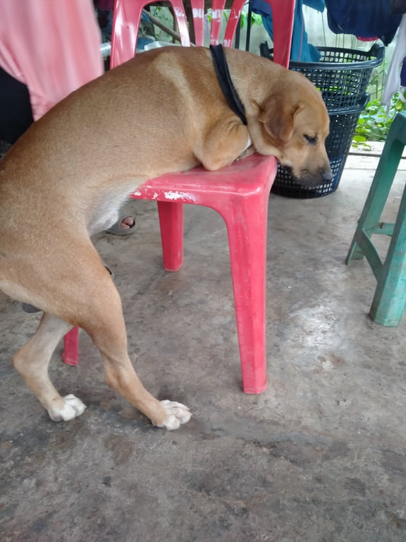 หูหนาและตกทั้ง2ข้าง ปลายหางมีจุดขาวๆ นิสัยไม่ค่อยกลัวคน เวลานั่งชอบนั่งยื่นขาหลังออกมา ปลอกคอเป็นผ้าสีฟ้ามีฝ้ายผูกแขนมัดไว้1เส้น