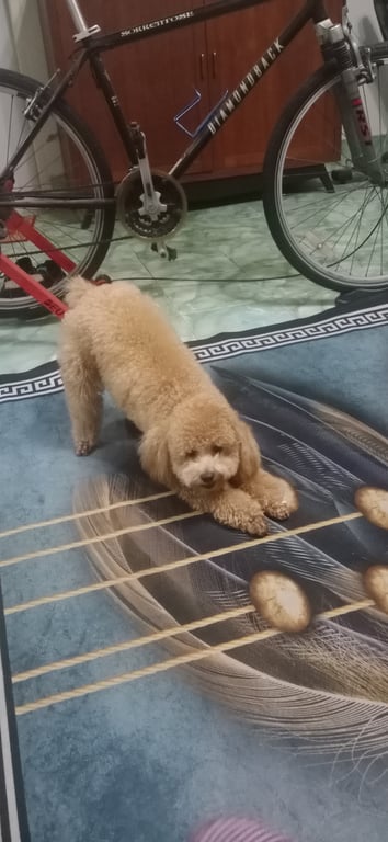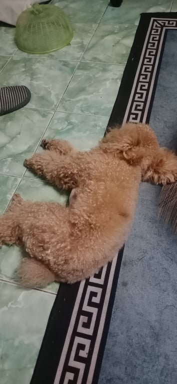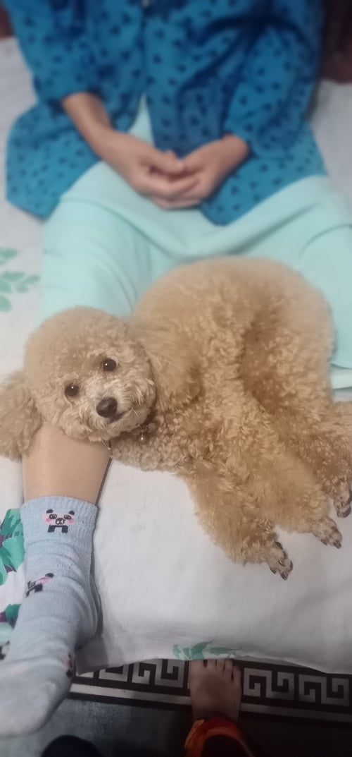 รอยตำหนิ: หางกุด ลำตัวด้านซ้ายมีตำหนิขนสีเข้มเหมือนปานไม่ให้คนไม่คุ้นจับตัว หวงที่ เห่าเก่ง