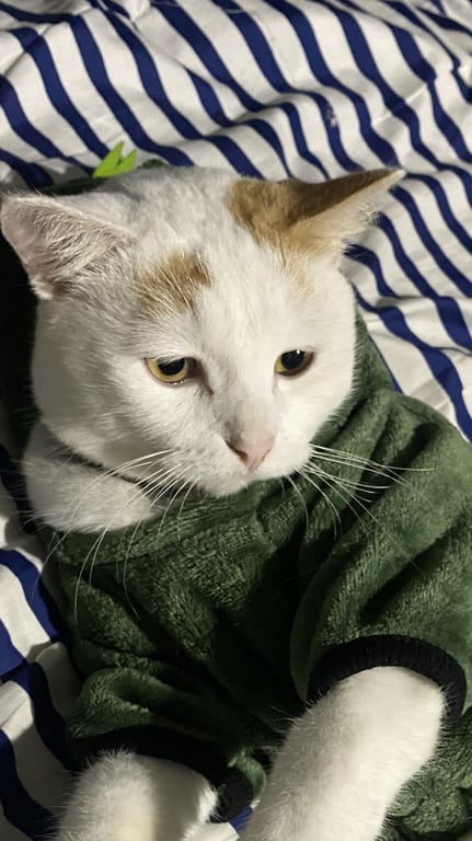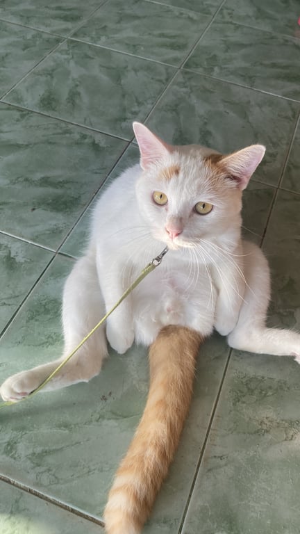 สี: ตัวขาว หูซ้ายสีนำ้ตาล มีจุดสีนำ้ตาลขวา หางนำ้ตาล