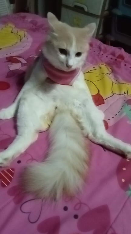 สีส้มจากหัวจนถึงหาง ตรงหน้ากับช่วงอก-ท้องและขาสีขาวหมด ซน ไม่ชอบให้ใครอุ้ม ชอบแหกปากร้องเสียงดังมาก