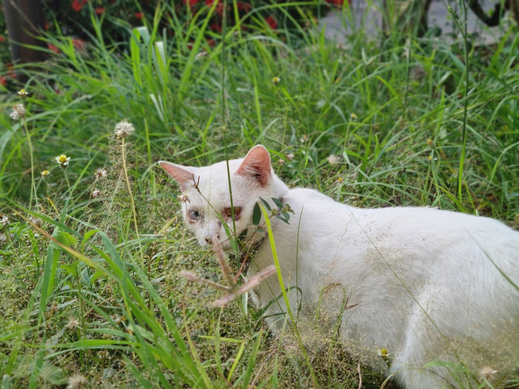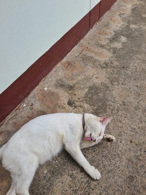 รอยตำหนิ: ตาสองสี ปลอกคอสีแดงอาจจะตกใจเมื่อเห็นคน แต่ถ้ามีของกินน้องอาจจะใจอ่อนค่ะ