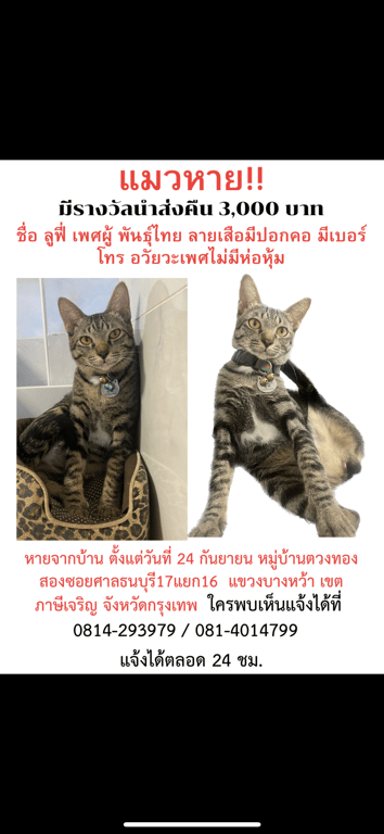 รอยตำหนิ: มีสีขาวตรงน่าอก อวัยวะเพศไม่มีที่ห่อหุ้มมีกระดิ่ง 2 อัน มีชื่อลูฟี่กับเบอร์โทรติดอยู่ที่ปลอกคอค่ะถ้าปลอกคอไม่หลุดหายปลอกคอสีเขียว ถ้าหลุดหายสังเกตได้จากอวัยวะเพศน้องได้ค่ะ จะไม่มีที่ห่อหุ้มจะปล่อยน้องให้ออกไปเล่นช่วงสายๆ เรากลับมาเค้าก็จำเสียงนถเราได้เราเรียกก็จะวิ่งกลับบ้านมาแล้ว น้องกลัวคนแปลกหน้า ถ้าไม่รู้จักจะไม่ค่อยชอบให้จับจะหนี ขี้กลัวมากๆ แต่นิสัยไม่กัดคนค่ะ มีชื่อลูฟี่กับเบอร์โทรติดอยู่ที่ปลอกคอค่ะถ้าปลอกคอไม่หลุดหายปลอกคอสีเขียว