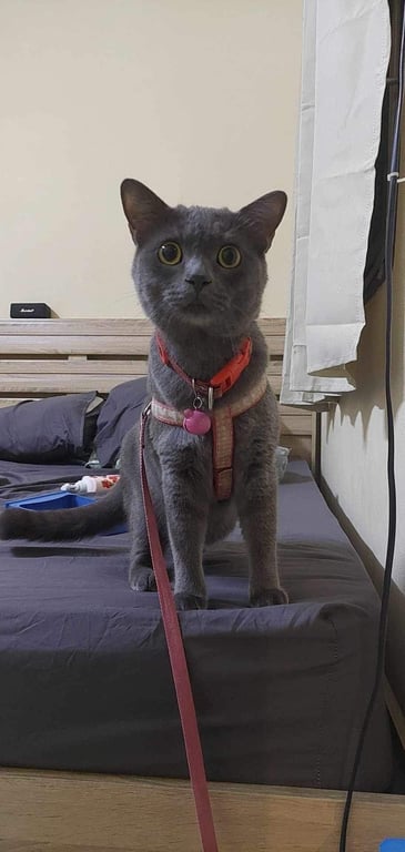 น้องใส่ปลอกคอสีแดง ติดเล่น จะขี้กลัว แต่ถ้าเอาอะไรมาล่อก็ไปตาม
