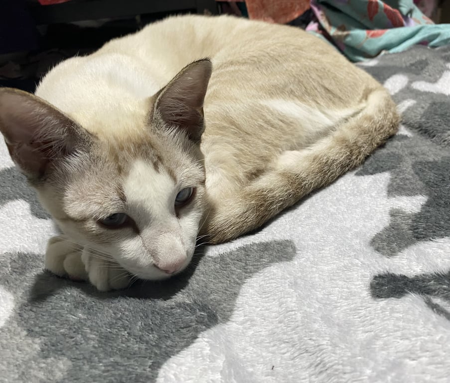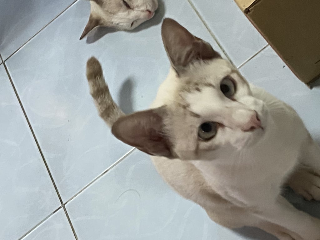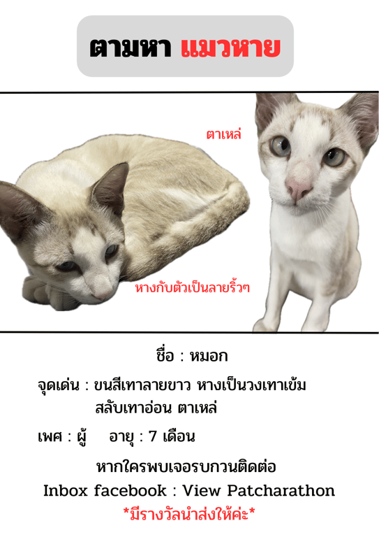 รอยตำหนิ: ตาเหล่ หางเป็นวงเทาเข้มสลับเทาอ่อน