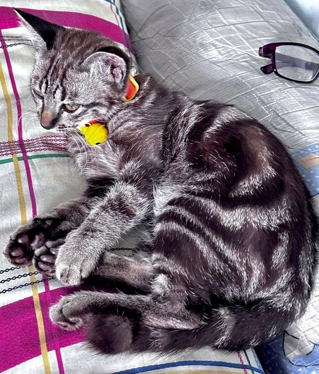 รอยตำหนิ สีน้ำตาลลายขาว หางกวัง ปลอกคอสีส้ม