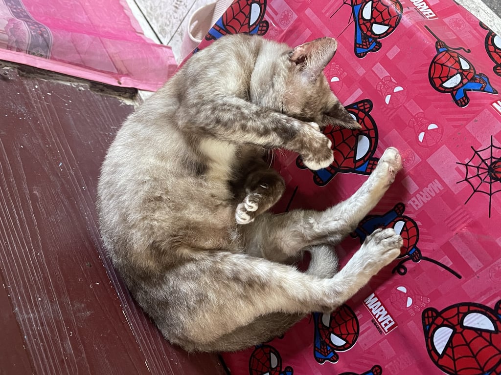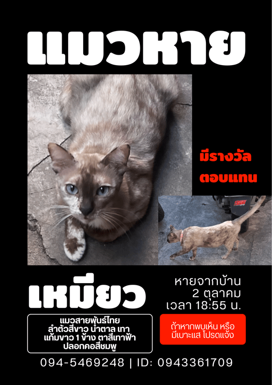 รอยตำหนิ: มีแผลที่ขาหน้า มีแก้มขาวปลอกคอสีชมพู ( ไม่มั่นใจอายุน้อง)