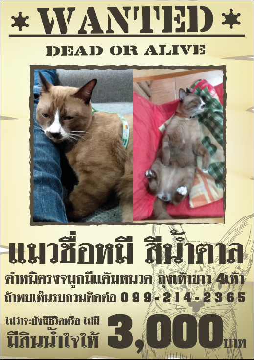 รอยตำหนิ: มีแต้มที่จมูก ลักษณะคล้ายหนวดของคนไม่ค่อยชินกับคนแปลกหน้า