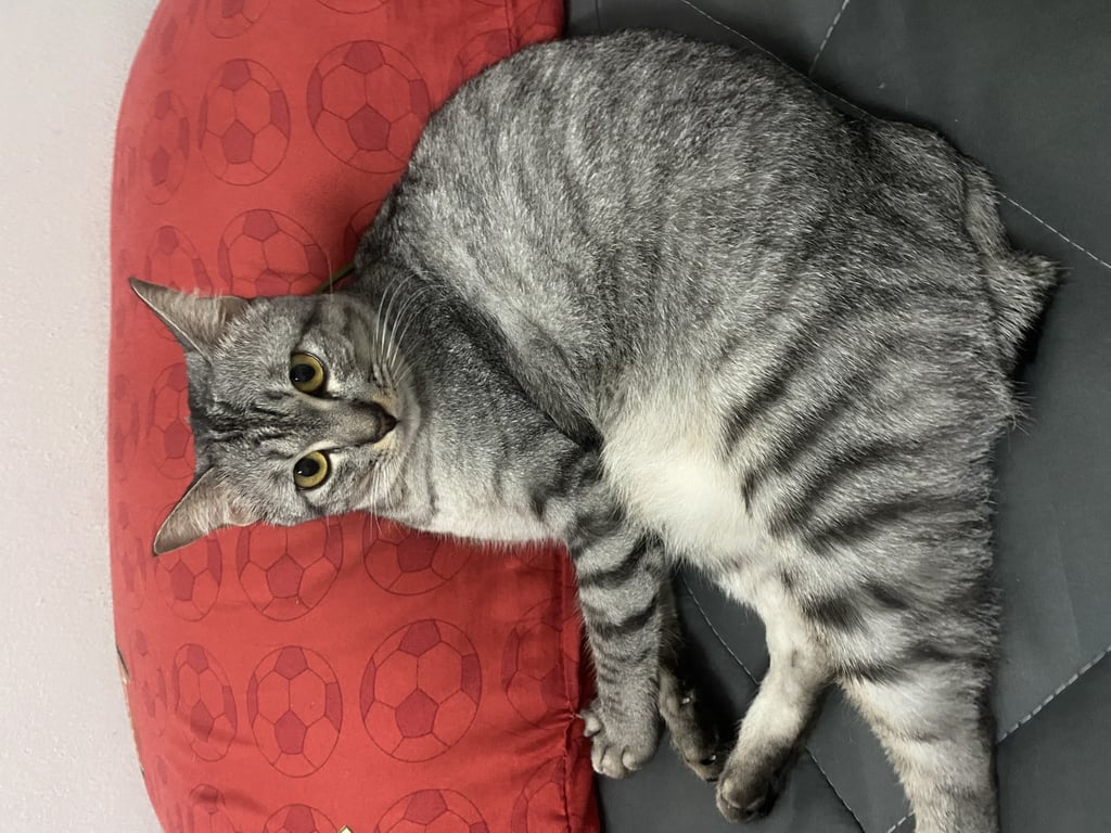 รอยตำหนิ: หางกุดน้ำหนักประมาณ 5 กิโล ฝ่าเท้าสีดำ ขี้กลัว พุงย้อยๆ