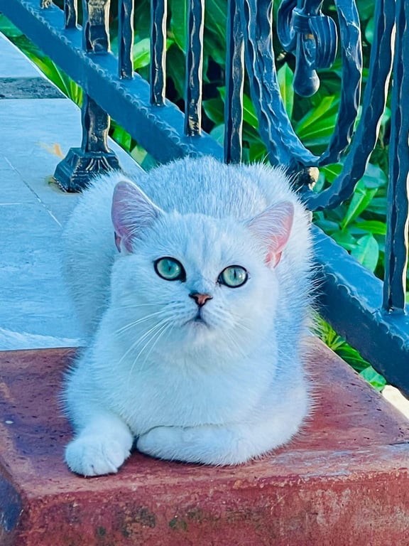 สี: ขาว มีขนเหลือบเทาตรงกลางหลัง จุดเด่นตามสายพันธุ์บริติช