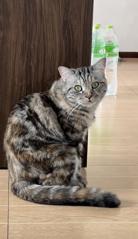 น้องแมวพันผสมช็อตแฮร์กับเปอร์เซีย น้องจะขี้กลัวหลบคนแปลกหน้า เป็นลายมีสามสี สีส้มแซม ตรงหน้าผากมีขี้สีส้ม