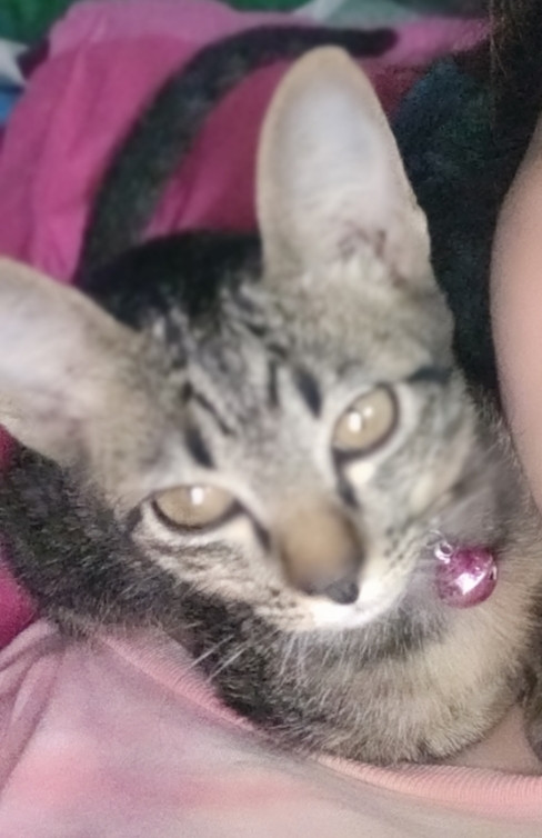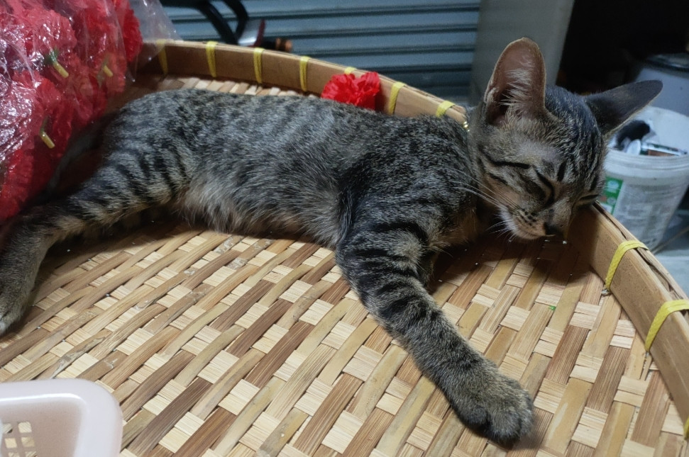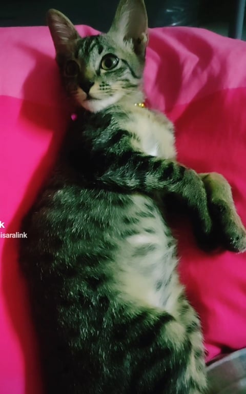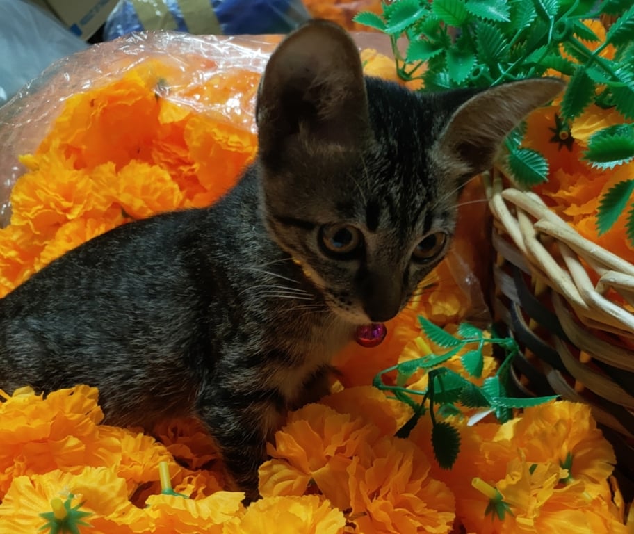 รอยตำหนิ: ปลายเท้าหลังมีสีขาว ที่คอมีสร้อยลูกปัดสีทองวัยเด็กกำลังซน