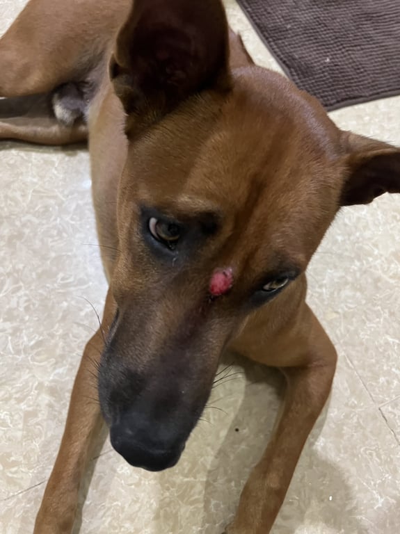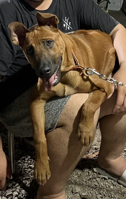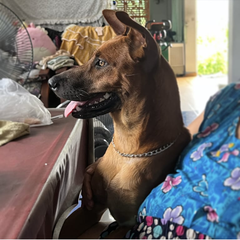 รอยตำหนิ: ไทยหลังอานสีน้ำตาลแดง มีรอยแผลเป็นกลางหน้า ตาเหลือง ฟันขาวขี้เล่นและติดคนมากๆ
