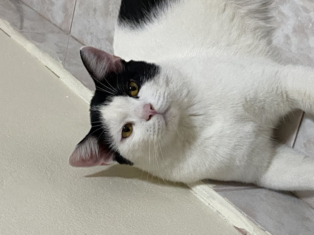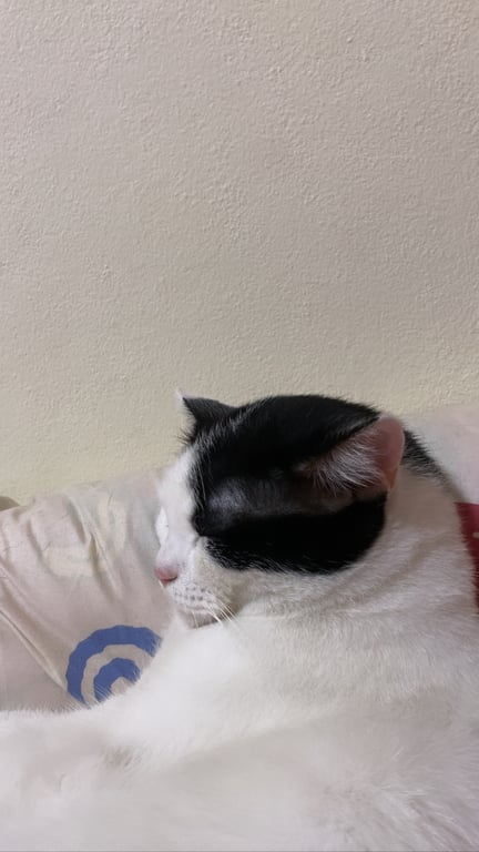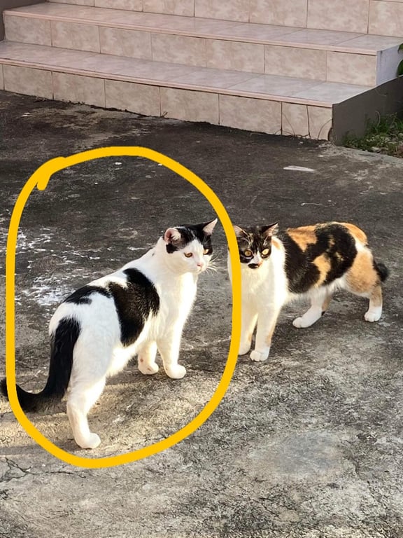 รอยตำหนิ: หน้าแฉก ขาวดำ หูสีดำ1ข้าง ขาว1ข้าง มีรูปโบว์สีดำอยู่ด้านข้างข้างหลังมีรูป หัวหมี สีดำ หางสีดำน้องกลัวคน แต่สามารถค่อยๆเข้าหาได้ ตัวอ้วนนิดนึง