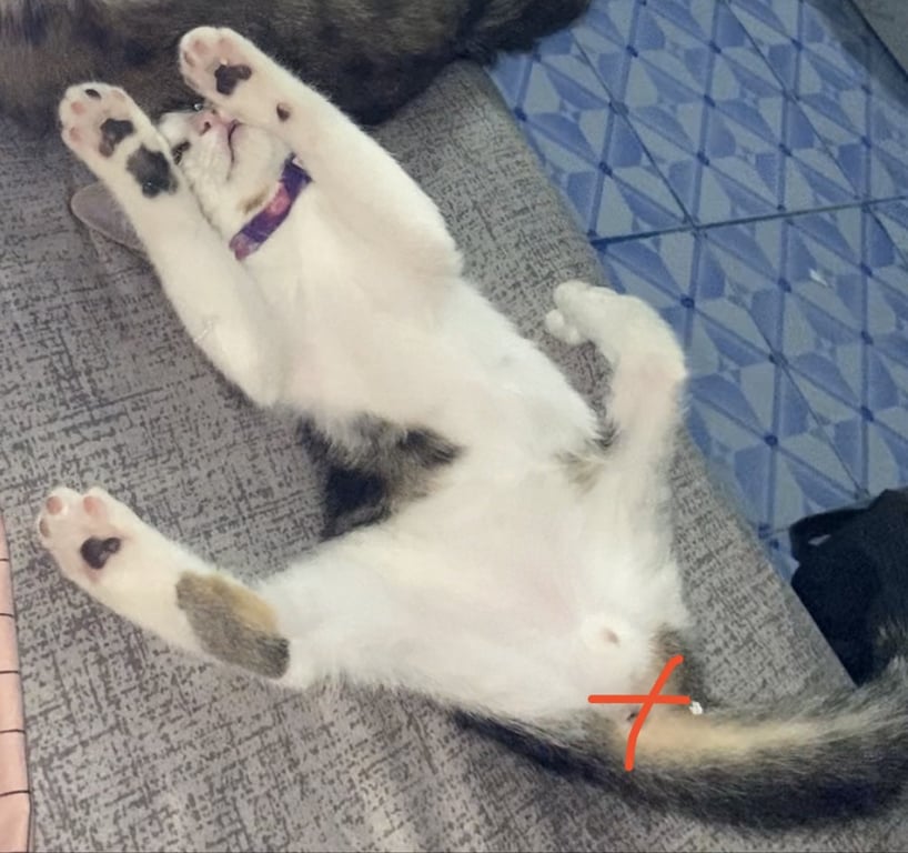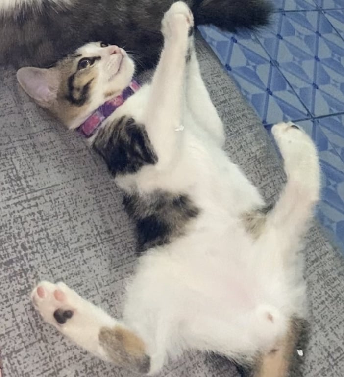 รอยตำหนิ: มีขนสีน้ำตาลอ่อนๆตรงคางเล็กๆวันที่หายใส่ปลอกคอสีม่วงชมพู อายุ 5-6 เดือน อุ้งเท้าสีชมพู ขี้อ้อน ชอบเอาตังเอาหัวถูคน