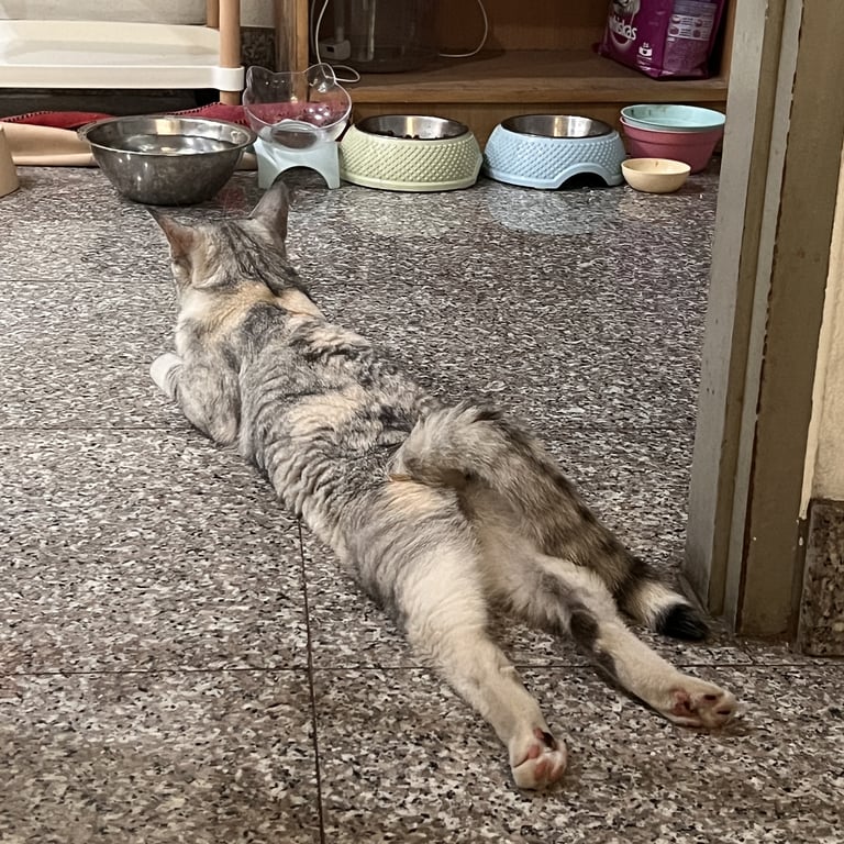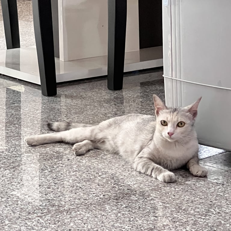 รอยตำหนิ: มีจุดดำที่ จมูกฝั่งซ้ายค่อนข้างดุ ไม่ยอมให้จับแน่ๆ น้องมีนิสัยขี้กลัว ชอบนอนท่ายืดขาหลังเหมือนซูเปอร์แมน