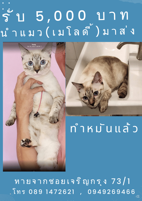 รอยตำหนิ: ตาสีฟ้าหายออกจากบ้านเวลา18/9/23 เวลา16.30น ในซอยเจริญกรุง73/1