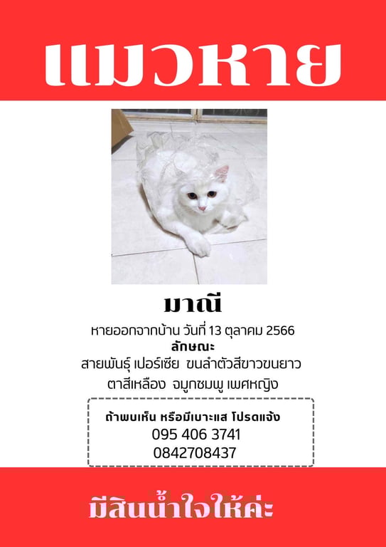 สี: สีขาวล้วน จมูกชมพู ตาสีเหลือง