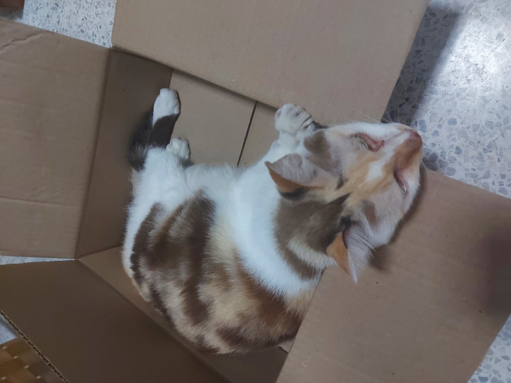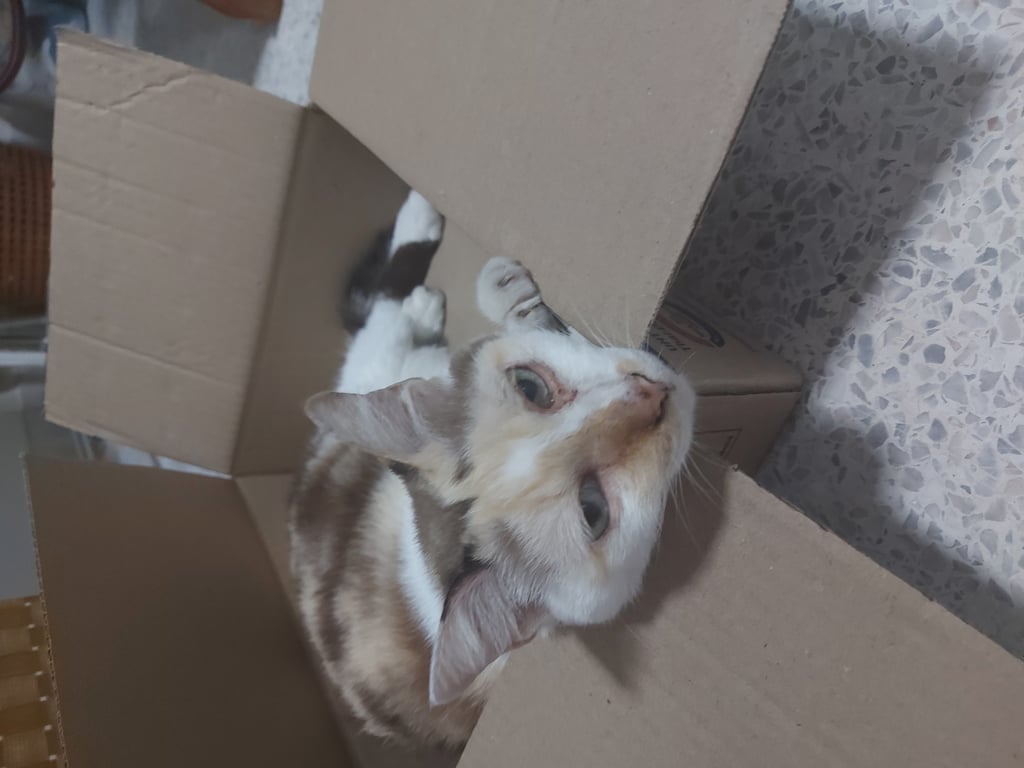รอยตำหนิ: ขนสามสีอ่อนๆ ขาว/ครีม/น้ำตาลน้องเป็นแมวแก่ ตัวบาง ปราดเปรียว ชอบเที่ยว