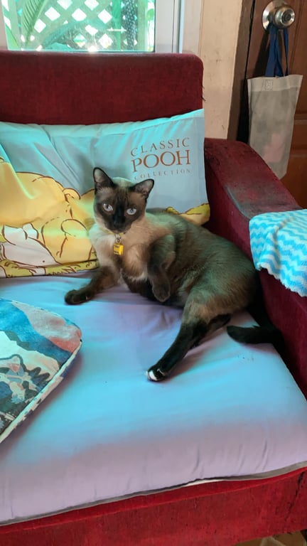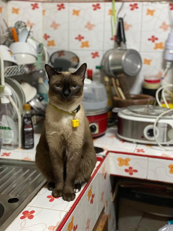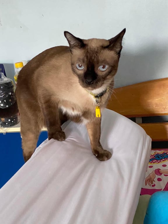 รอยตำหนิ: เท้าหลังมีสีขาวแต้มหนึ่งจุดกลัวคนแปลกหน้า มีปลอกคอสะท้อนแสงสีเหลือง กระดิ่งเมโลดี้สีชมพู