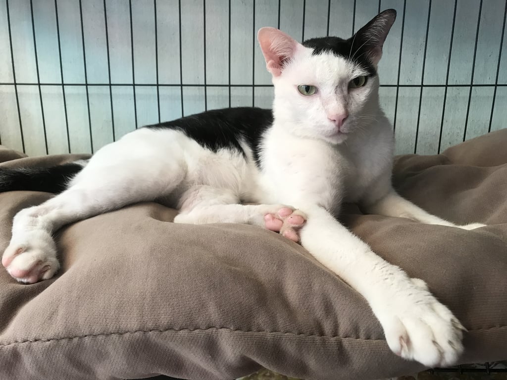สี: สีดำขาว หน้าเมือนทรงผมเป๋ 1 ข้าง ลำตัวมีสีดำเหมือนอานม้า หางสีดำ ตาเขียวเหลือง