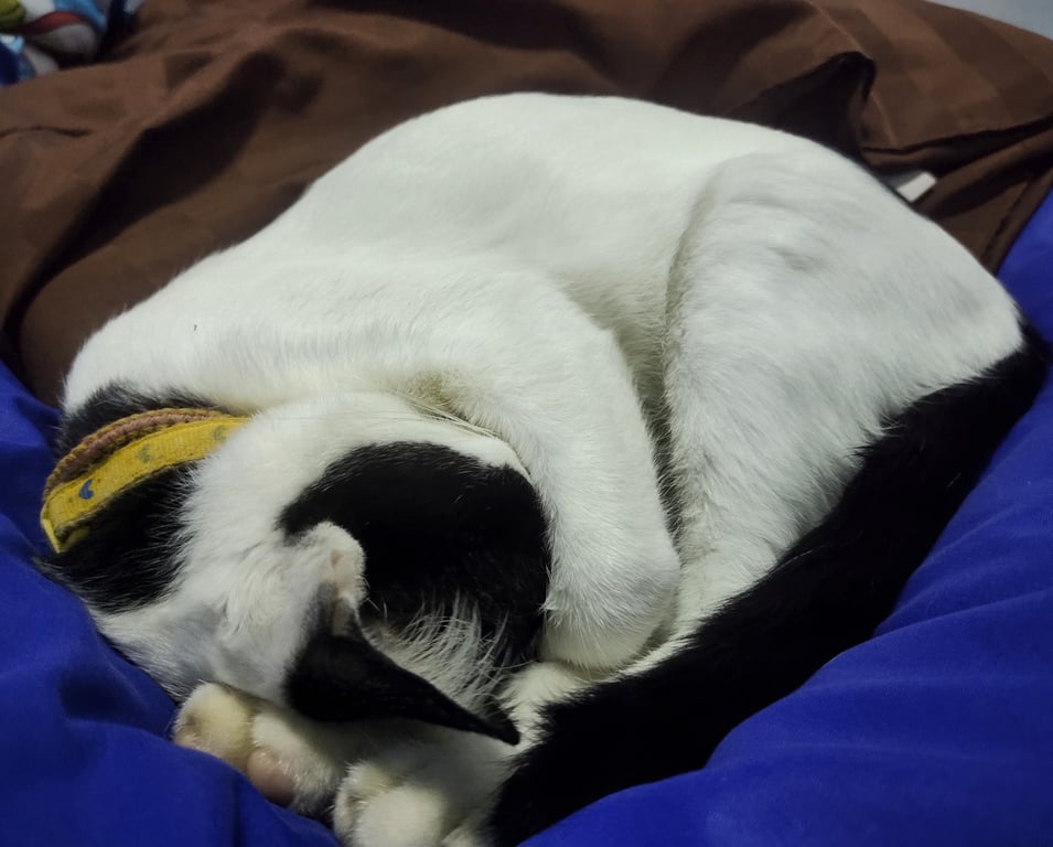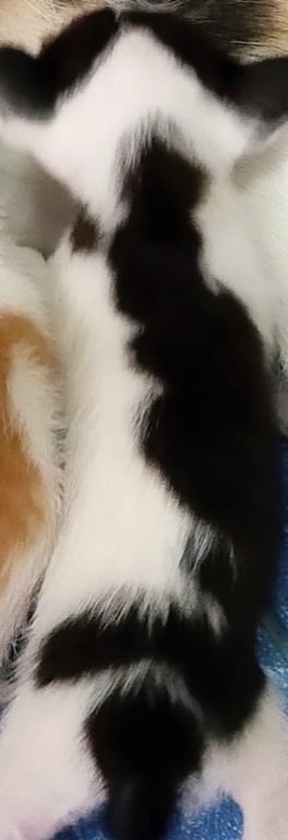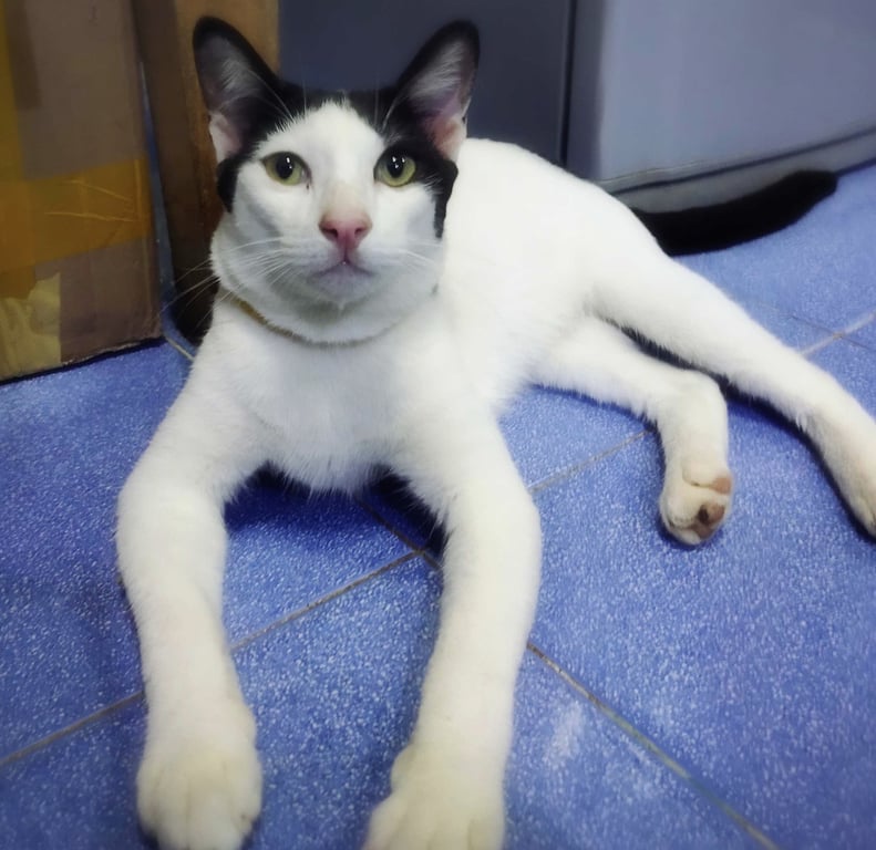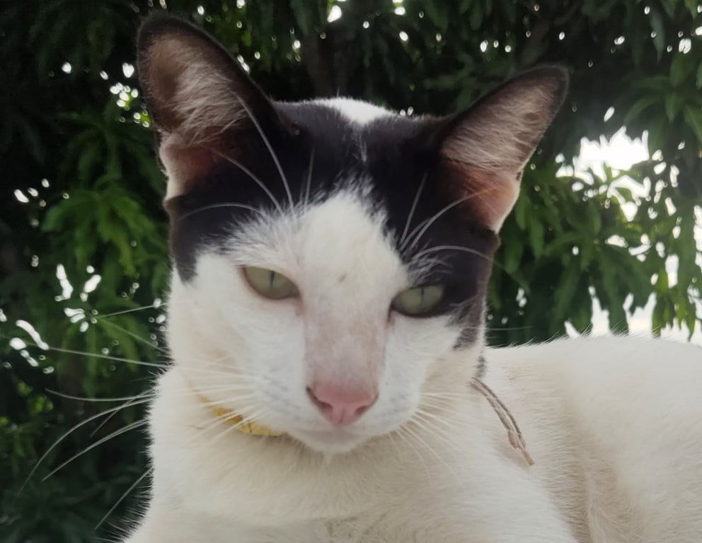 รอยตำหนิ: ปลอกคอสีเหลือง ที่คอมีฝ้าผูกแขนด้วยลายขาวดำ หลังแบ่งครึ่งขาวซีกนึงดำซีกนึง หน้าจะมีสีดำตรงหัวเหมือนผมแสกกลาง ที่ขอใส่ปลอกคอสีเหลืองมีฝ้ายผูกแขน 1 เส้น ที่คางจะมีเคราแพะเล็กๆ