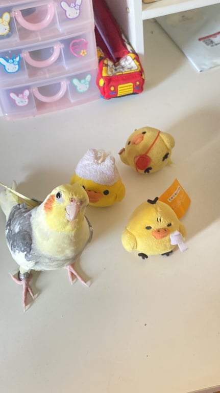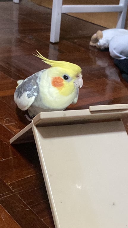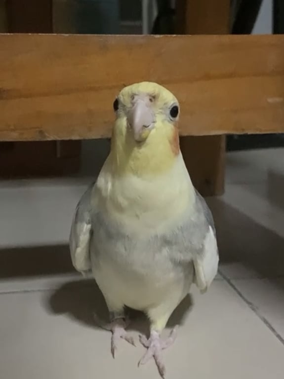 สี: สีเหลือง แก้มสีส้ม มีจุก ปีกสีเทา ข้อเท้าสีเทามีห่วงคล้องอยู่อีกที