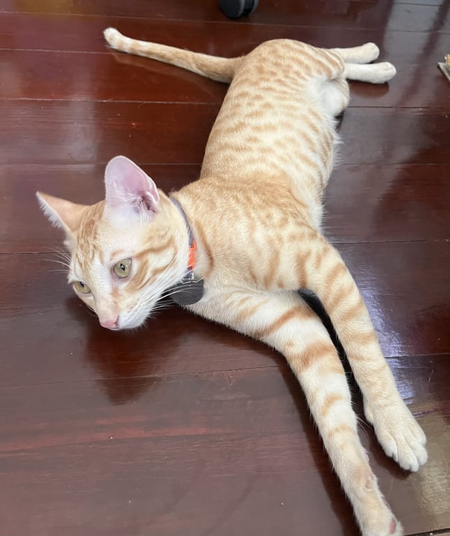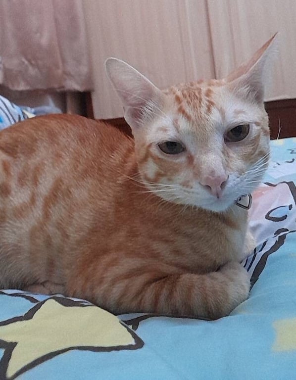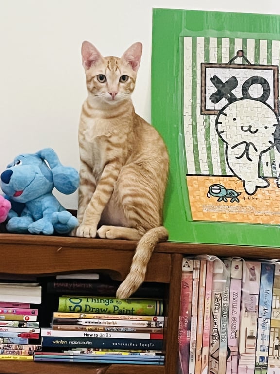 สี: สีส้มลายสะลิด ขนแข็งไม่ฟู หางยาว หน้าจะสีอ่อนกว่าตัว หูตั้ง