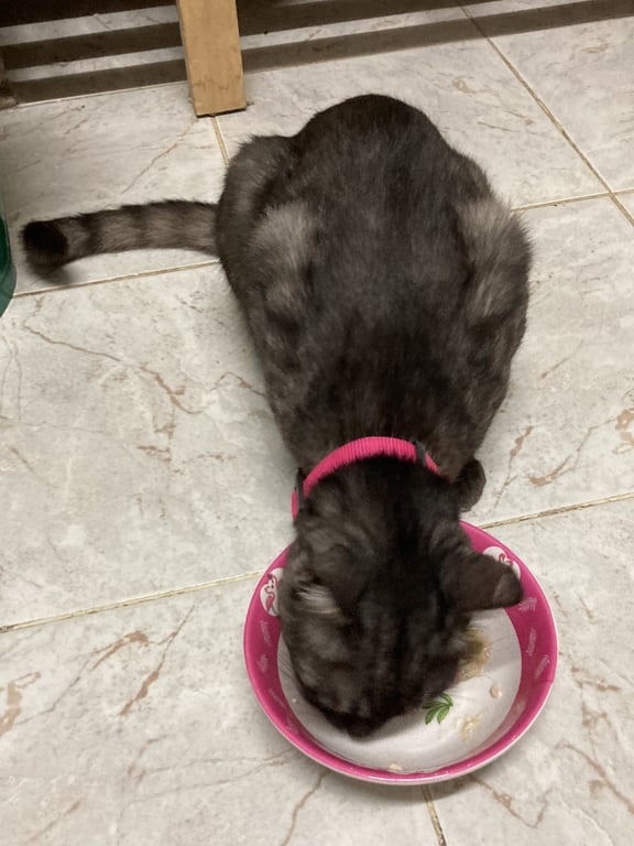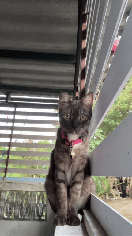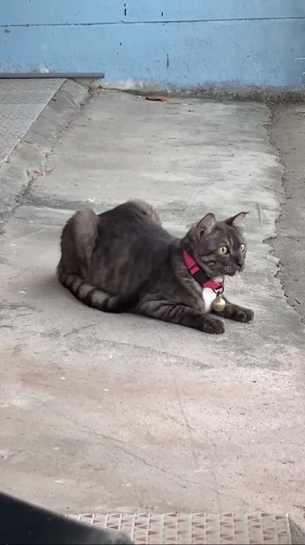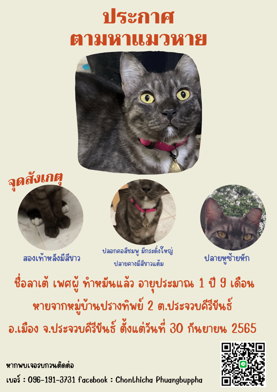 รอยตำหนิ: ปลายหูข้างซ้ายหัก ปลอกคอสีชมพูสะท้อนแสง มีแต้มสีขาวตรงคาง สองเท้าหลังมีสีขาวบริเวณปลายเท้าไม่ชอบเสียงดัง จะวิ่งเตลิดไปหาที่ซ่อน ไม่ดุร้าย เป็นแมวตัวยาวหางยาวกว่าแมวปกติทั่วไป