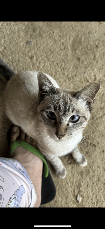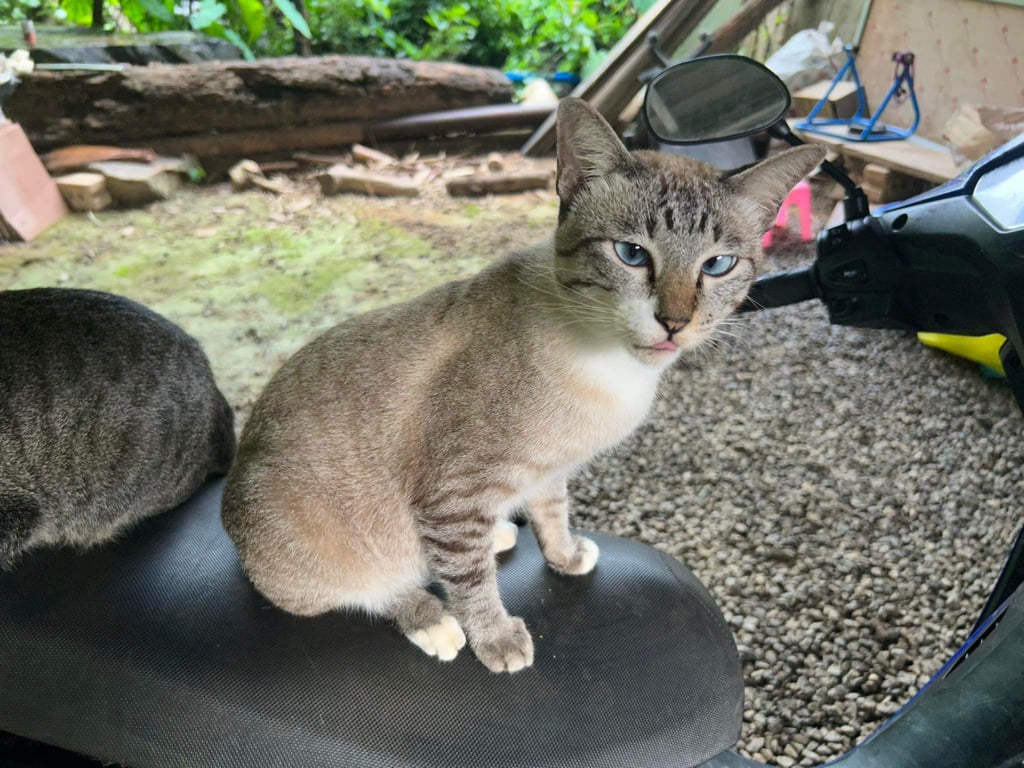 สี: หู2ข้างดำ ตาสีฟ้า หางลายดำๆ ตัวสีขาวหม่นๆน้ำตาล