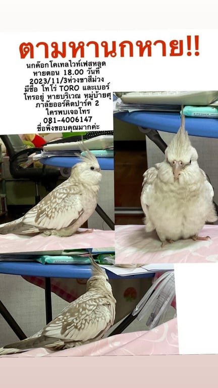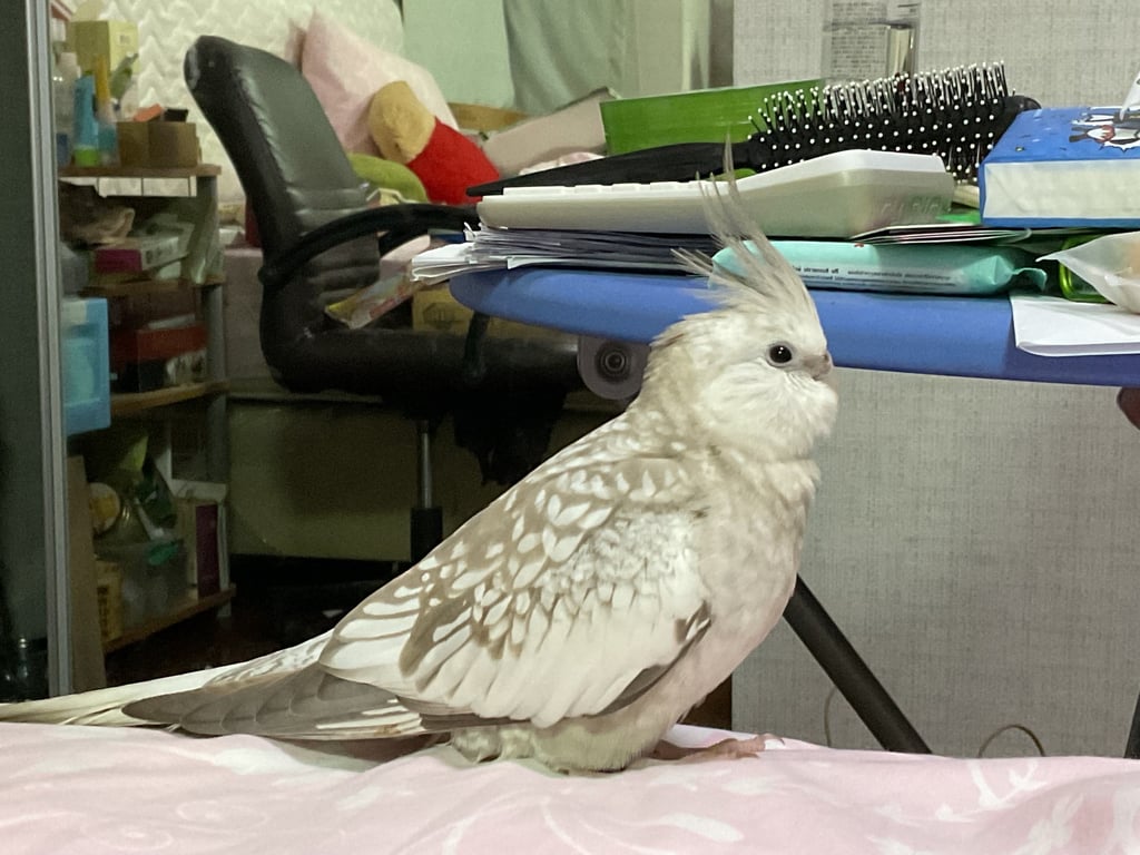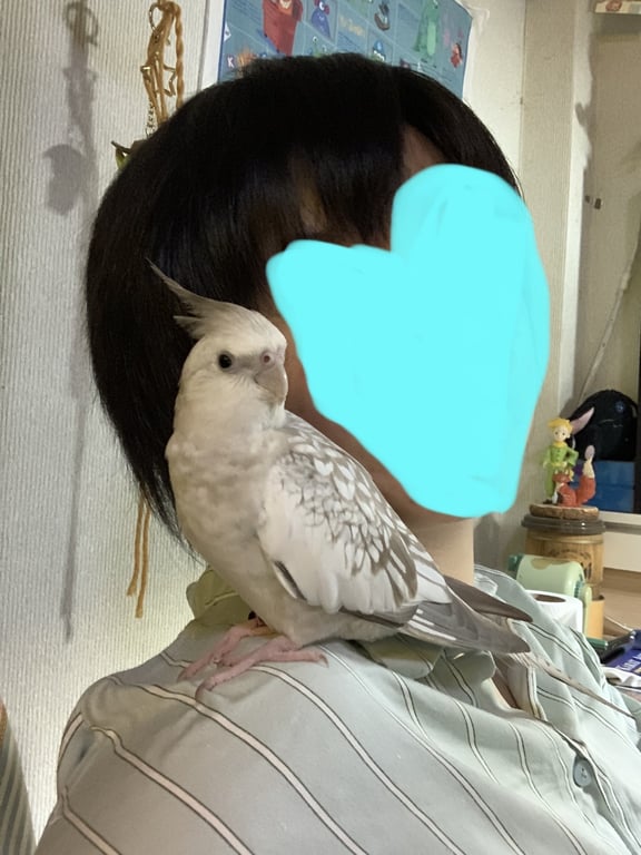 รอยตำหนิ: มีสีเทาเล็กๆติ่งๆปีกบน คล้ายขนคิวปิด / มีรอยเปื้อนคราบสีแดงหม่นที่ปีกนิดหน่อย1จุดบริเวณปีกบินเหมือนนกค๊อกคาเทลทั่วไป ชอบอยู่เครื่องใช้ไฟฟ้า กับที่แคบๆ ช่วงนี้กำลังน่าจะติดสัตว์ อ้อนเป็นพิเศษ เสียงเล็กเสียงน้อย ถ้าไม่พอใจหวงที่จะกรี๊ดดังมากและอาจฉกกัดได้ แต่ตอนเชื่องก็เข้าได้ทุกคน ชอบเจ๊าะแจ๊ะ เดินตามพื้น และหาทีีเล่น แทะขอบบ้าน กัดนุ่นนี่