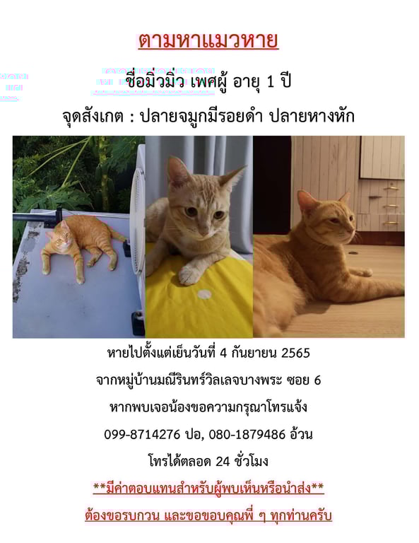 ชื่อมิ่วมิ่วแมวสีส้ม อายุ 1 ปี หายจากหมู่บ้านมณีรินทร์วิลเลจบางพระ หมู่10 ตำบลบางพระ อำเภอศรีราชา จังหวัดชลบุรี 20110 ตั้งแต่เย็นวันที่ 4 กันยายน 2565 หากพบเจอกรุณาแจ้งที่ 0998714276 ปอ และ 0801879486 อ้วน มีค่าตอบแทนสำหรับผู้พบเห็นจนรับตัวน้องได้หรือผู้นำส่งครับ