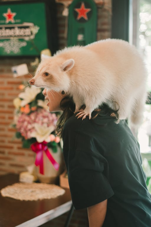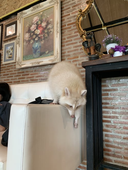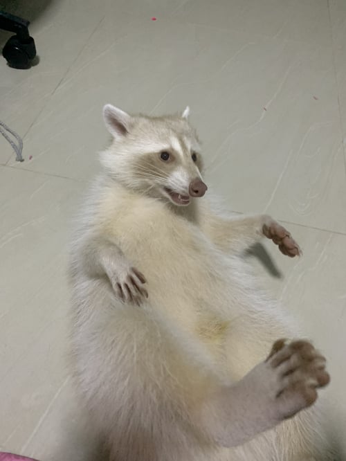รอยตำหนิ: หน้าเหมือนหมาจิ้งจอก ตัวอ้วนกลม หางลายปล้องๆจิมโบเป็นแร็กคูนไม่ใช่หมา หรือแมว น้องชอบเสียงกรุ๊งกริ๊งๆ เช่นเสียงเหรียญหรือกุญแจกระทบกัน แต่น้องกินอาหารหมา น้องกลัวหมา ชอบแอบอยู่ในซอกๆ และชอบปีนป่าย