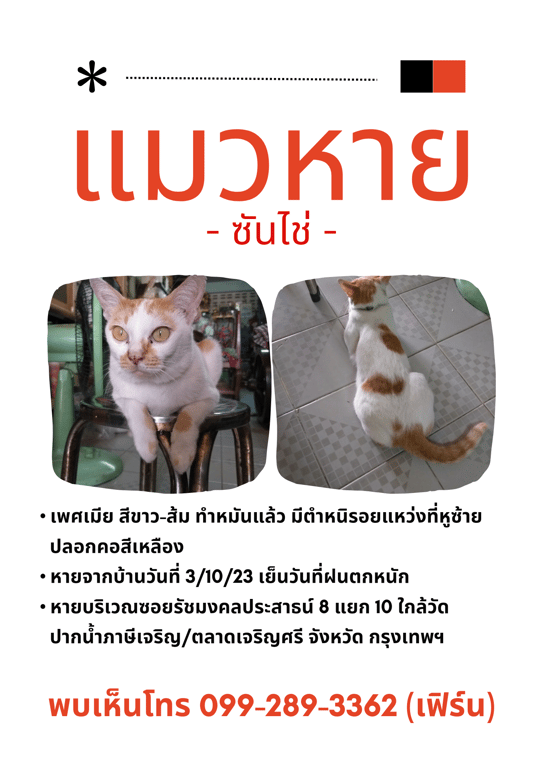 รอยตำหนิ: มีรอยแหว่งเล็กๆที่หูด้านซ้าย วันที่หายมีปลอกคอสีเหลือง