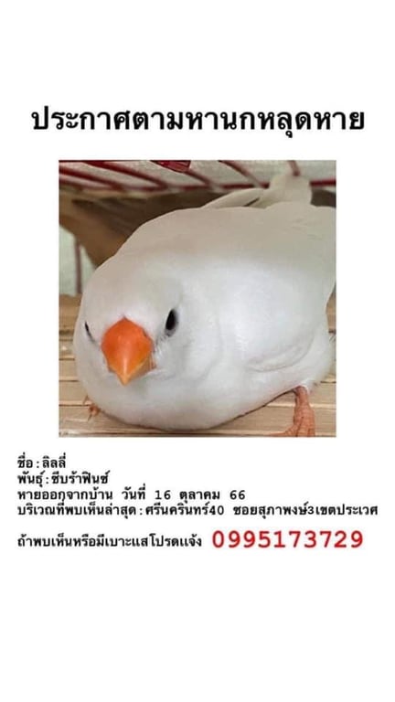 รอยตำหนิ: น้องมีขนาดคล้ายนกกระจอกทั่วไปเเต่มีสีขาวลิลลี่เป็นนกขี้กลัว ตกใจง่ายน้องไม่เชื่อง เป็นนกเรียบร้อย รักสงบ ร้องเสียงเหมือนเป็ด เสียงเบา ร้องไม่บ่อย น้องเข้ากรงเองได้ จำชื่อตัวเองได้ถ้าเรียกเป็นเสียงสองจะขานรับ