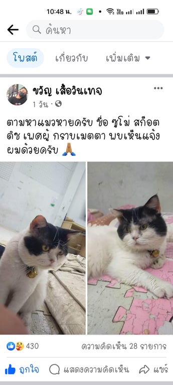รอยตำหนิ: ไม่มีน้องเพศผู้ แมวพันธุ์ผสมค่ะ น้องหายจากบ้านตั้งแต่ 25/11/66 ชื่อซูโม่ อายุประมาณ 2ปี ท่านได้พบเห็น หรือแจ้งเบาะแสทีค่ะ ตอนนี้เจ้าของทุกข์ใจมากเป็นห่วงน้องมาก น้องไม่เคยออกจากบ้าน น้องขี้ตกใจ กลัวน้องเป็นอันตราย เป็นห่วงน้องจนกินข้าวไม่ลงแล้วค่ะ