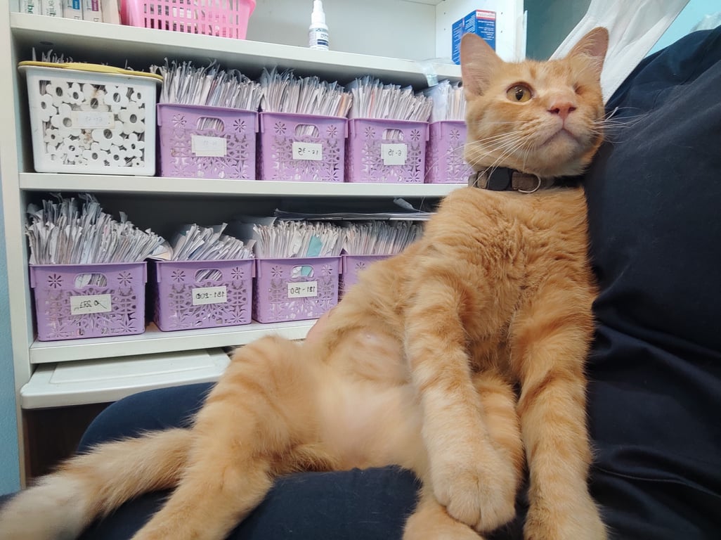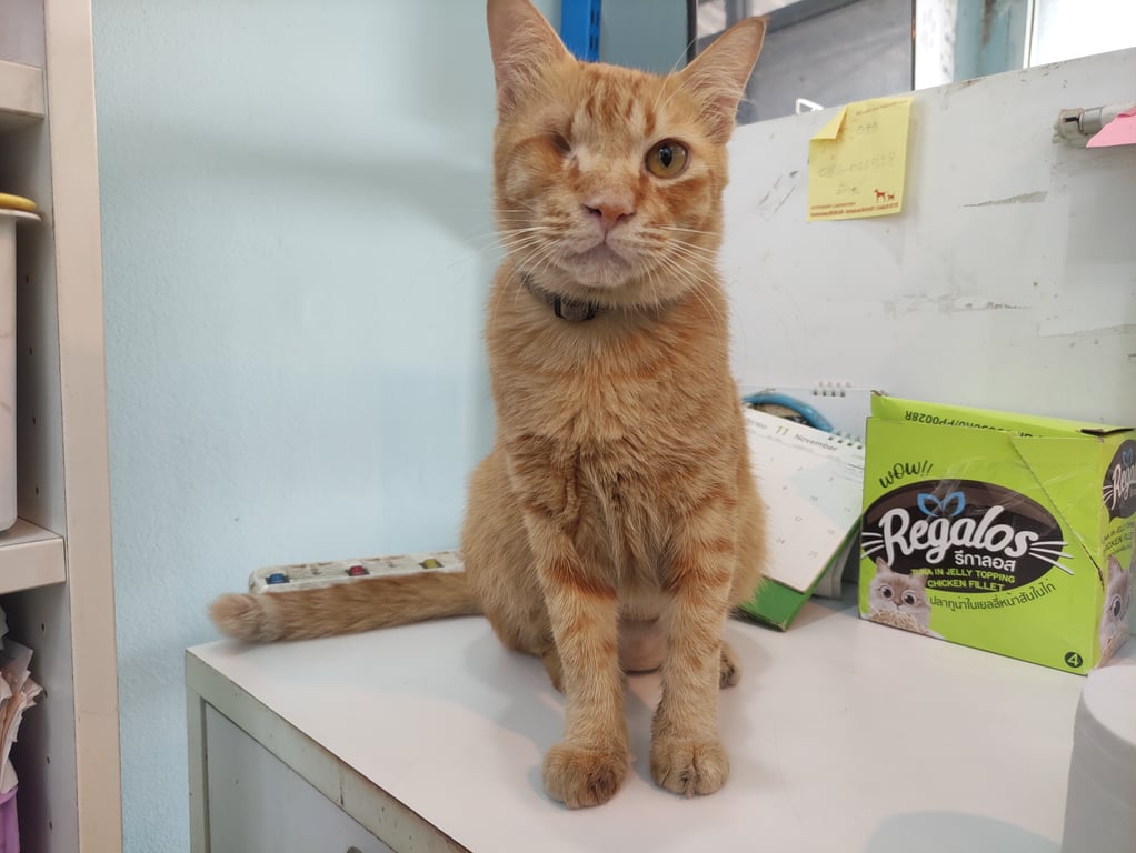 รอยตำหนิ: มีตาข้างเดียว, ใต้คางมีรูจากลวดตอนมัดกราม, ฟันเขี้ยวบนด้านขวาหักครึ่งเป็นมิตรกับคน ไม่กลัวหมา ขี้อ้อน