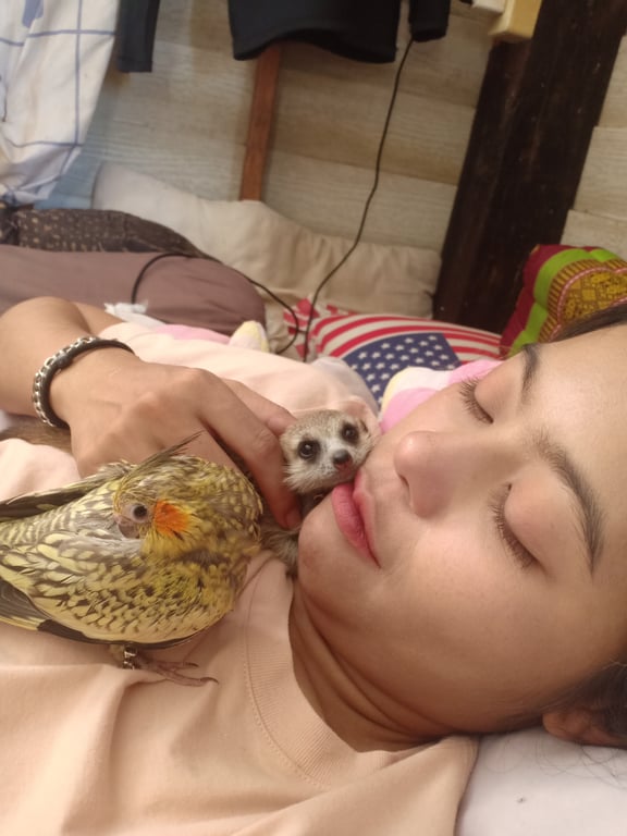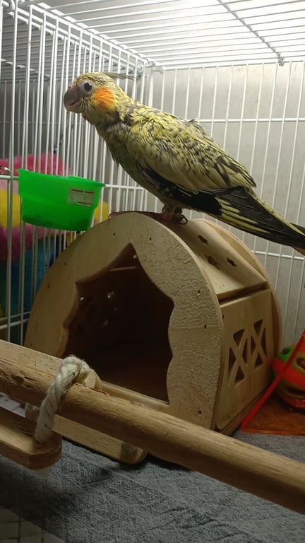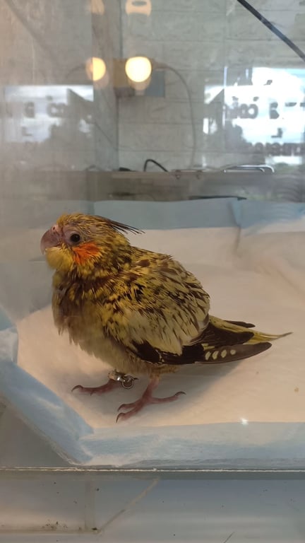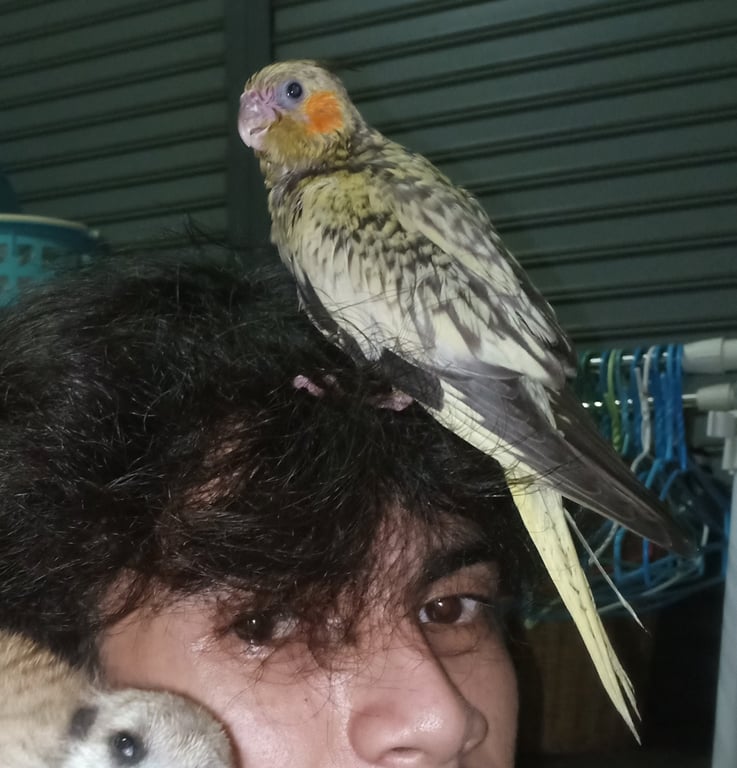 รอยตำหนิ: สีเหลืองแซมดำเทา แก้มสีส้ม ปากอมชมพูเทา ปลายปีก2ข้างสีดพ หางเหลืองติดดำนิดหน่อย มีห่วงเงินที่ข้อเท้าอายุราวๆ2เดือน นิสัยติดคน ขี้อ้อน ไม่กลัวคนแปลกหน้า เรียกชื่อแล้วขานรับ