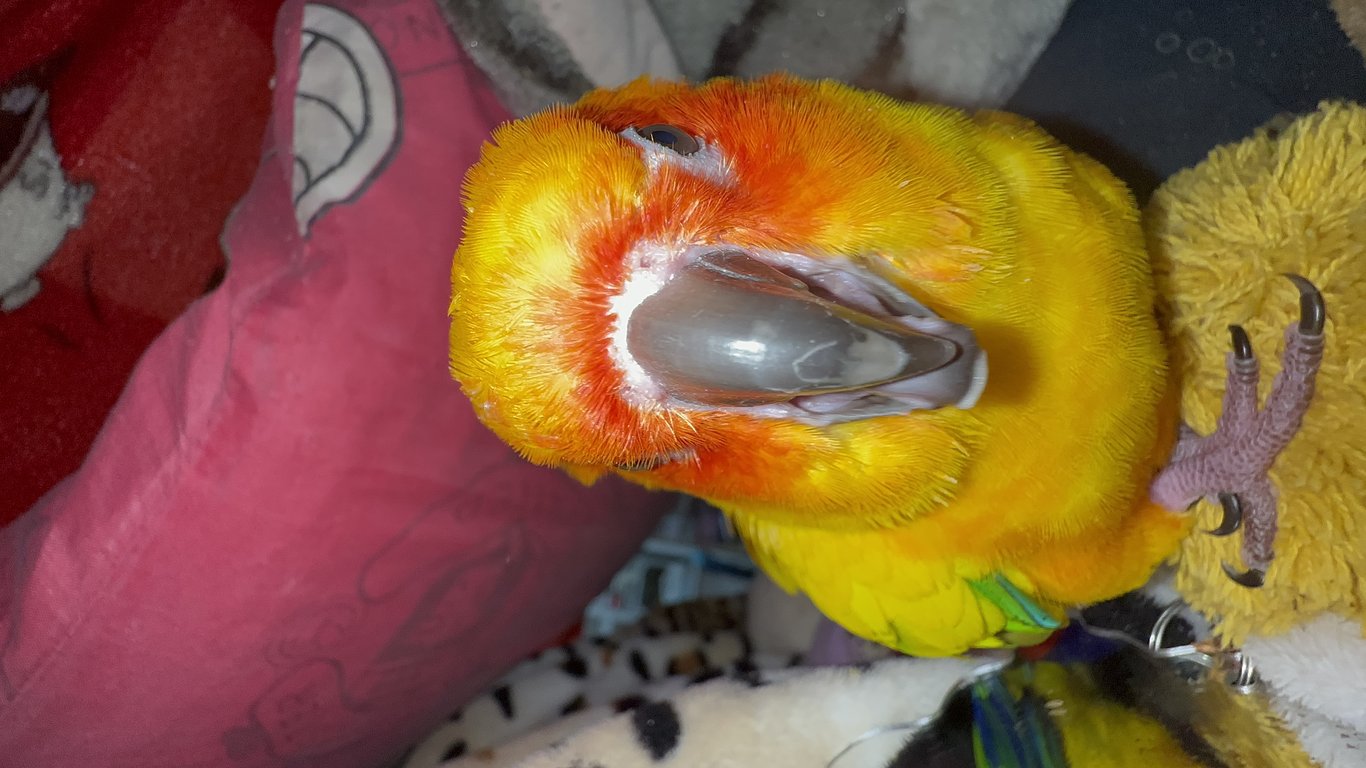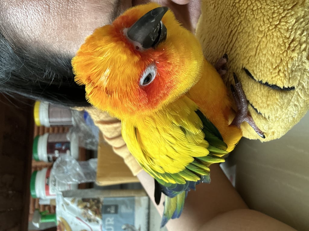 สี: ตัวสีเหลืองแก้มสีส้มปีกสีเขียวจะมีขนพาย
