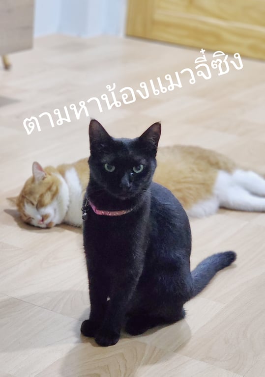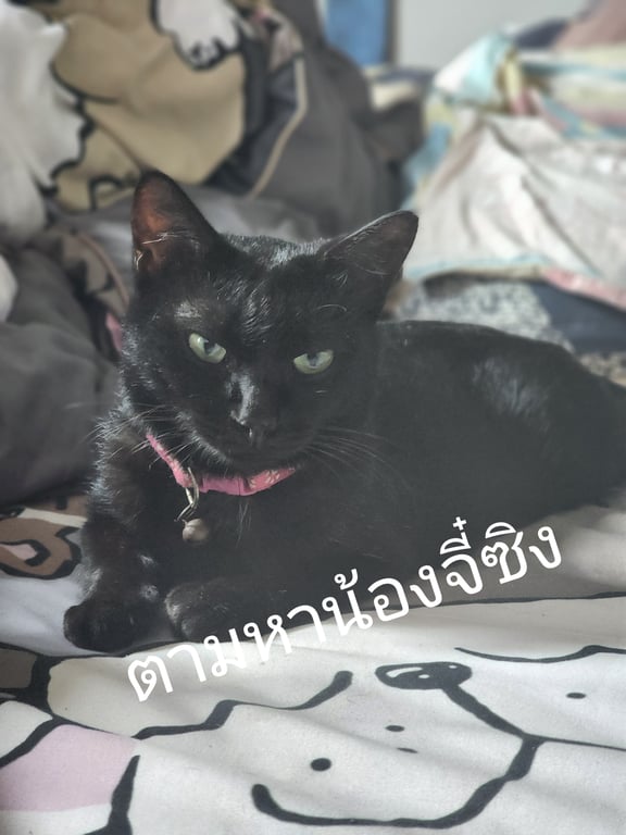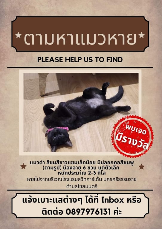รอยตำหนิ: ปลอกคอสีชมพู กระดิ่งเล็กๆลักษณะ : แมวดำ สีขนสีขาวแซมเล็กน้อย มีปลอกคอสีชมพู (ตามรูป) น้องอายุ 6 ขวบ แต่ตัวเล็ก หนักประมาณ 3 กิโล นิสัย : ขี้ระแวง แต่ไม่กลัวคน เพศ : หญิง ทำหมันแล้ว น้องหายไปจากบริเวณโรงแรมสวีทการ์เด้น นครศรีธรรมราช ตำบลไชยมนตรี อำเภอเมือง จังหวัดนครศรีธรรมราช เมื่อเที่ยงวันที่ 1 ธันวาคม 2566 คาดว่าน้องติดรถลูกค้าที่กำลังเดินทางไปทางจังหวัดกระบี่