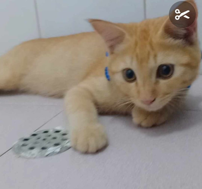 รอยตำหนิ: จุดสังเกตคือมีปลอกคอสีน้ำเงินเป็นแมวสีส้มหางยาวตัวผู้อายุประมาณ 6 - 7 เดือนตัวค่อนข้างใหญ่ ตาสีส้ม สวมปลอกคอแมวนิรภัยสีน้ำเงินลายจุด ชอบเล่นไม้ตกแมวมาก ขนค่อขนข้างเยอะและนิ่ม ร้อนง่าย