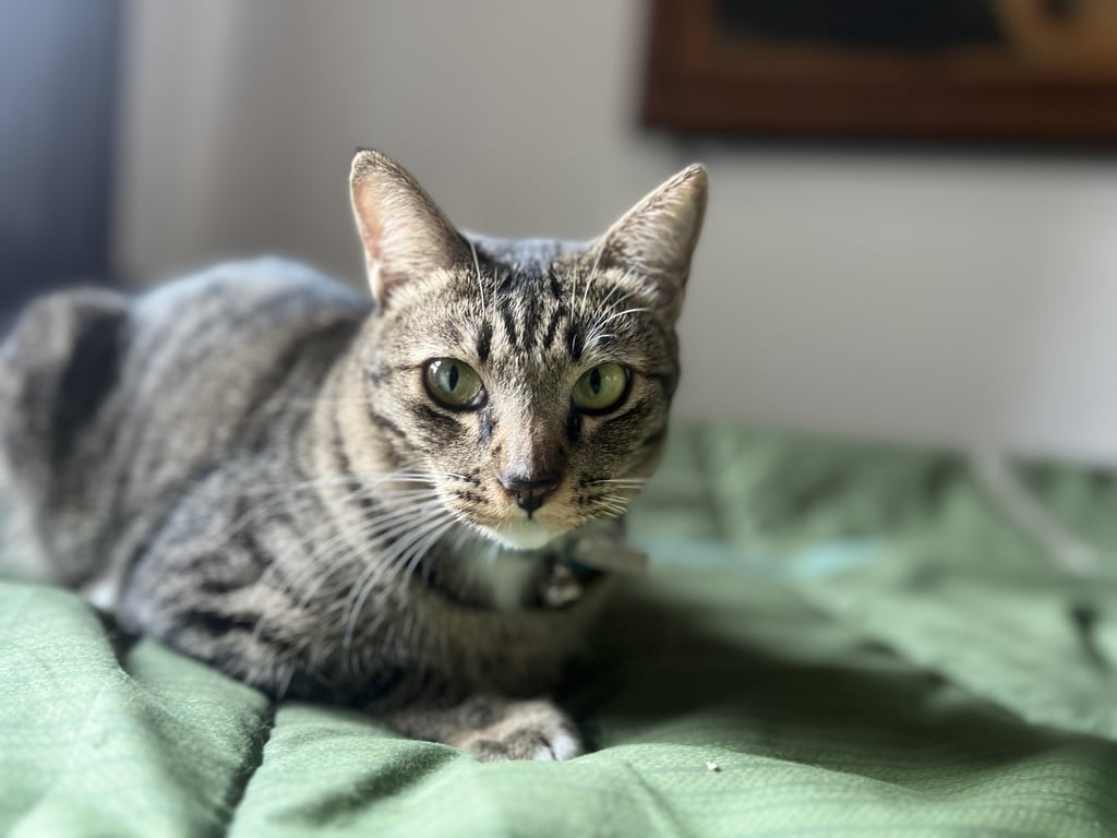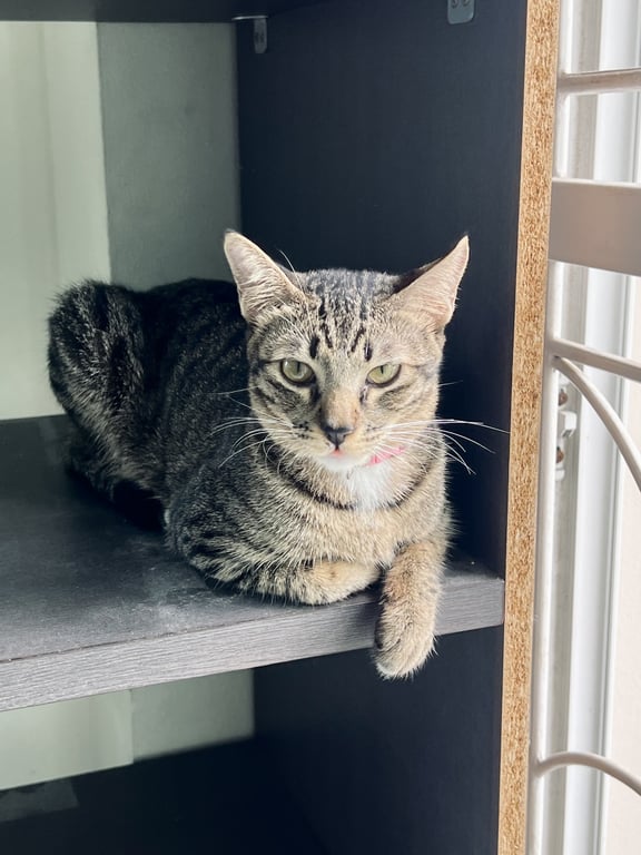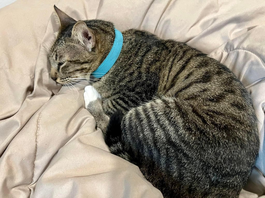 รอยตำหนิ: เท้าสีขาว สวมปลอกคอสีชมพูสดไม่กลัวคน แต่ไม่ชอบให้จับตัว