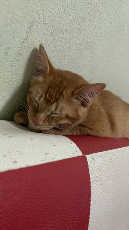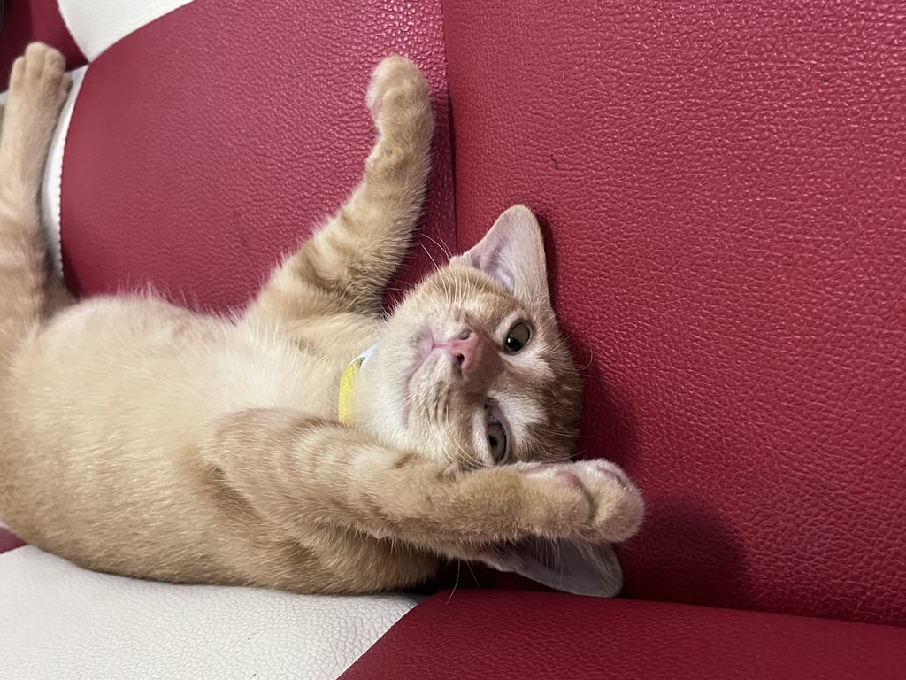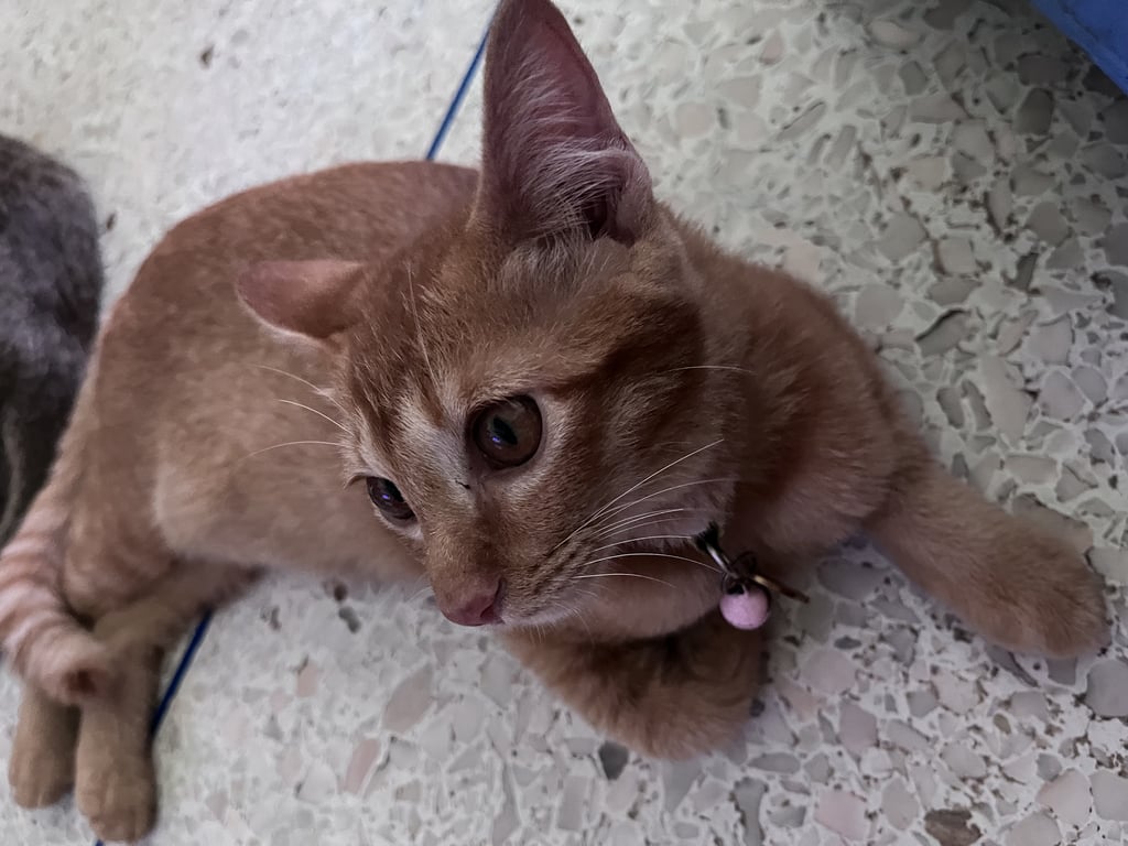 รอยตำหนิ: ลายส้มสลับขาวตรงขาตรงหาง มีปลอกคอสีเหลืองมีป้ายชื่อจะร้องเสียงเล็กๆ ไม่ชอบคนเยอะ ชอบหลบไปที่เงียบๆ อุ้มได้แต่ไม่ให้อุ้มนาน