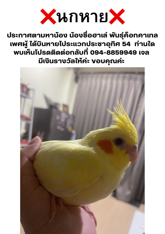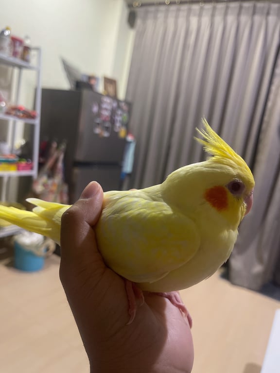 รอยตำหนิ: ตรงปีกจะมีคล้ายๆติ่งเนื้อนูนๆเล็กน้อยขนปิดไม่หมดน้องขี้ตกใจมาก ต้องค่อยๆพูดเพราะถ้าเสียงดังมากจะชอบบินเตลิด