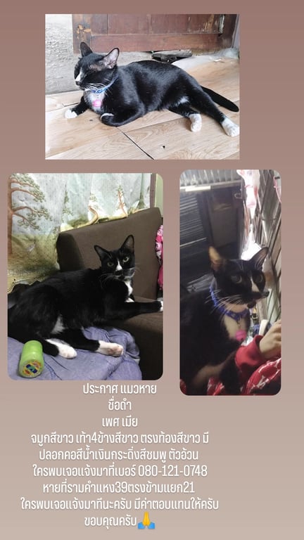 สี: ดำมีสีขาวบริเวณข้างหน้า และที่เท้า