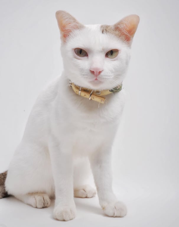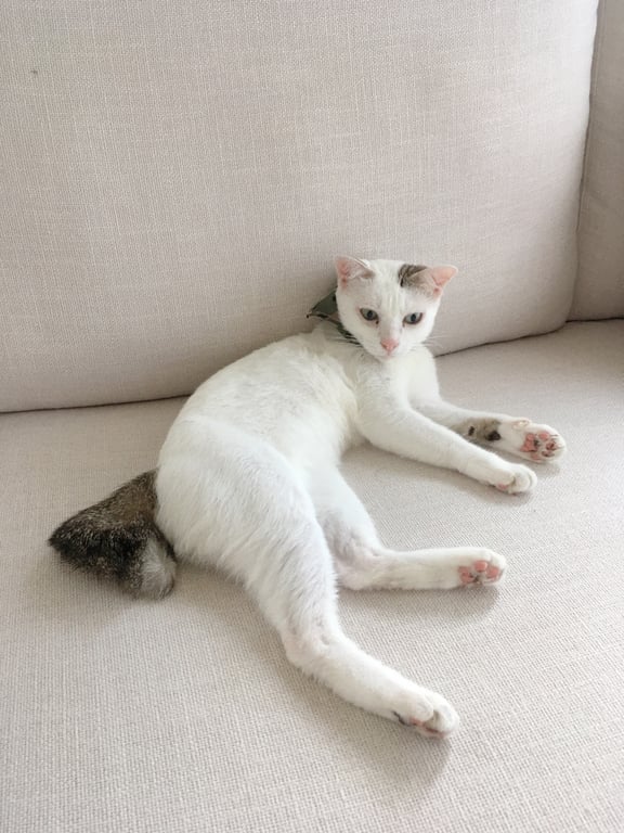 รอยตำหนิ: มีแต้มบนหูด้านขวา หางกุดและกวักมีปัญหาเกี่ยวกับระบบประสาทตั้งแต่เด็ก ต้องทานยากันชักทุกวัน ท่าทางจะงงๆ แต่ใช้ชีวิตได้ตามปกติ เป็นมิตร ขี้เล่น ชอบอยู่กับคน แต่ก็ไม่ชอบให้จับมากๆ