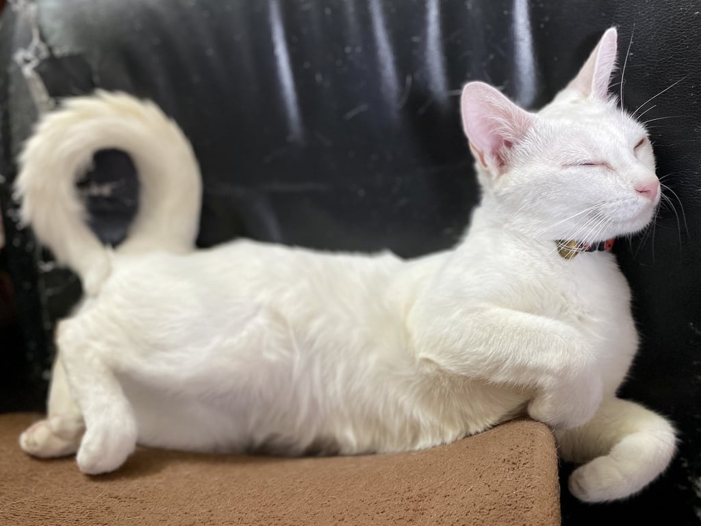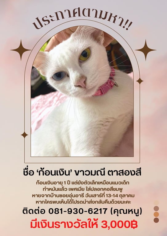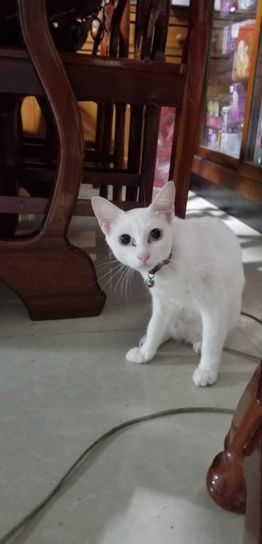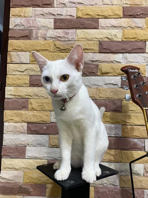 รอยตำหนิ: ตาสองสี /สีขาว/ตัวเล็กใส่ปลอกคอสีชมพู