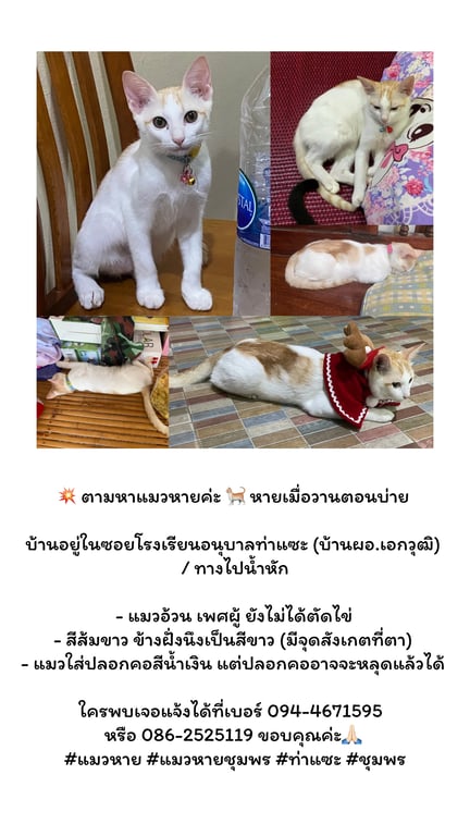 รอยตำหนิ: ตาขีดอายไลเนอร์ทั้ง2ข้างสีส้มเชื่อง เป็นมิตร ไม่กลัวคน ไม่กลัวหมา